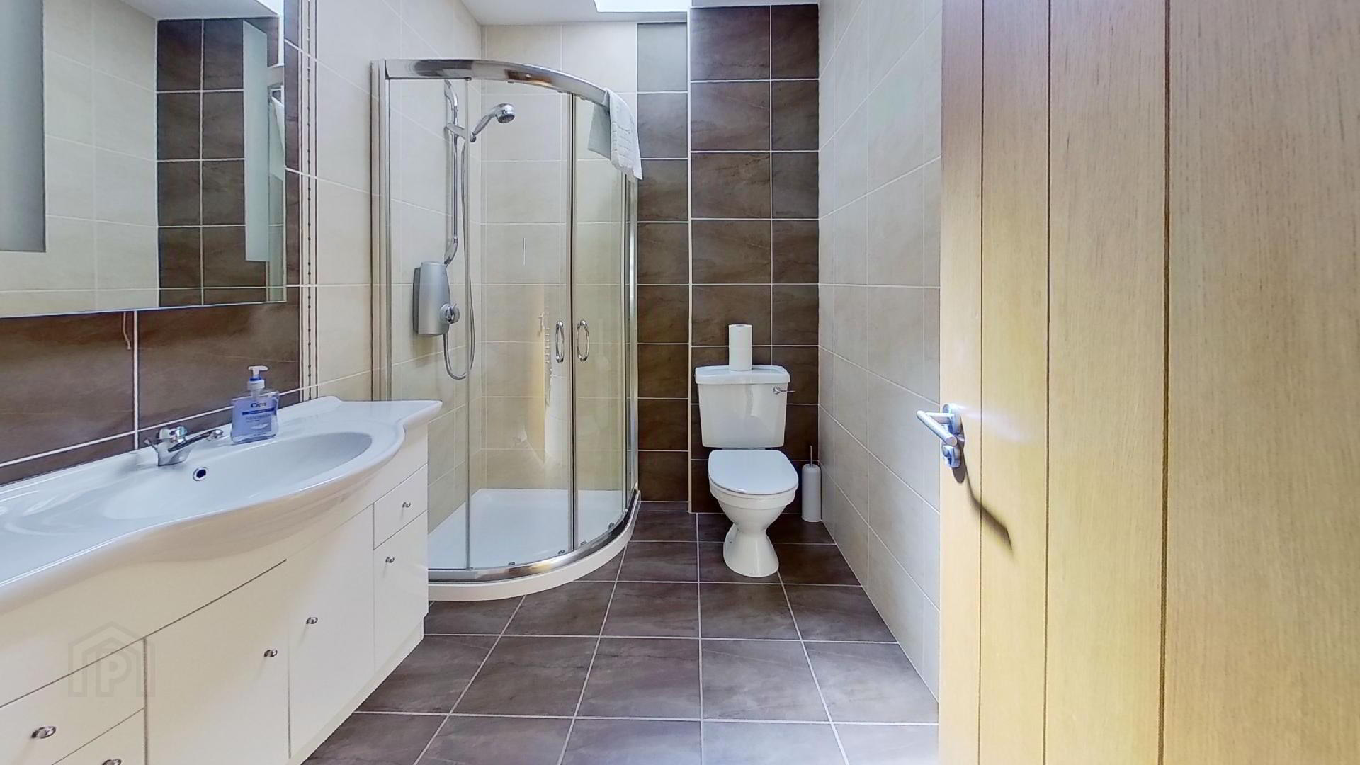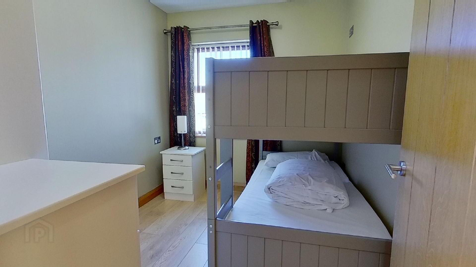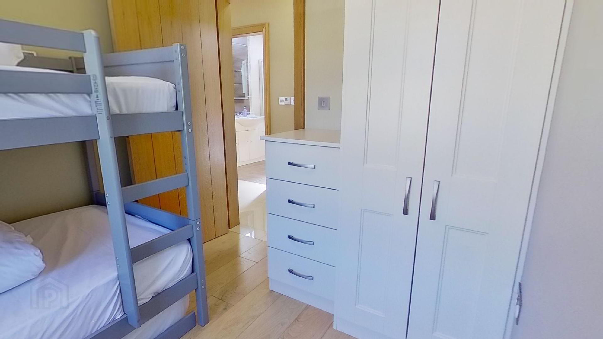 The modern fully tiled bathroom boasts a power shower. Both bedroom spaces include fitted furniture, one with a double bed and the other with a triple bunk bed.