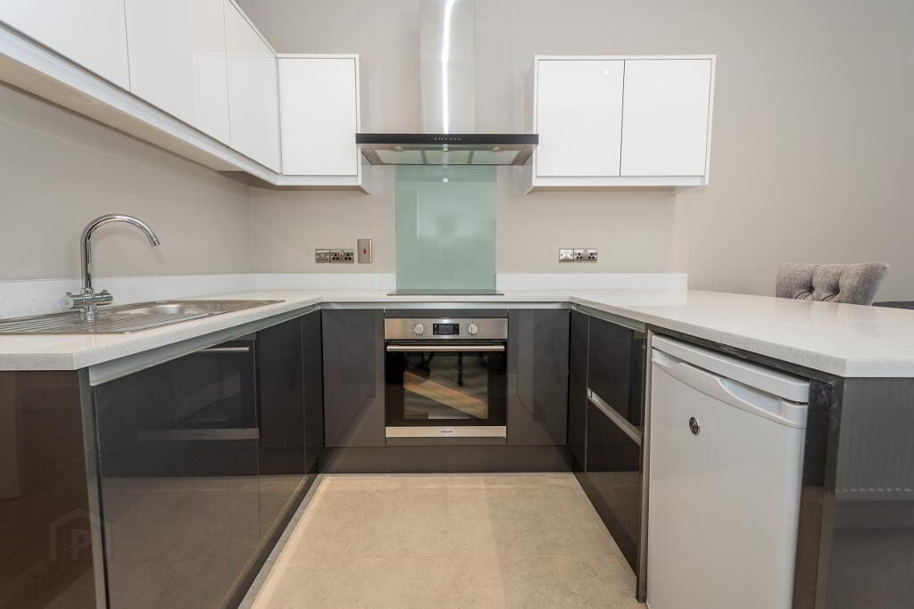 Once inside the apartment the decor is modern and fresh. Off white ladder doors with chrome ironmongery take you from the hall to each room. The large open plan kitchen and living room are bright and airy with ample recessed LED lighting. The ultra modern fitted kitchen comes with a range of premium appliances. A breakfast bar hosts room for two bar stools comfortably. Two expansive windows allow natural light to flood into the space. The living area benefits from beautiful contemporary furniture. A handy intercom system is also located here.