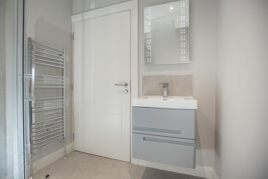 The modern bathroom boasts a shower with designer wet wall panels, back to wall WC, wall hung sink with LED demisting mirror and chrome towel rail. Both bedroom spaces include trendy double beds, wardrobe with drawer and bedside unit. The apartment also hosts a utility room cupboard for washing and storing clothes.