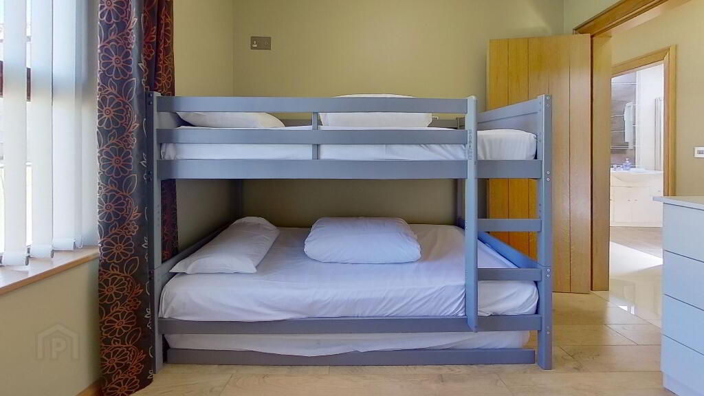 The modern fully tiled bathroom boasts a power shower. Both bedroom spaces include fitted furniture, one with a double bed and the other with a triple bunk bed.